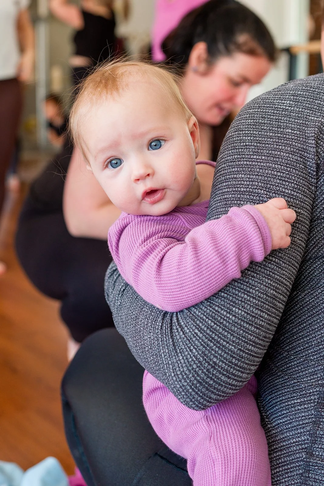 Our Signature Workout is a fully standing barre style workout that is a great first choice- especially if you want to baby-wear the whole class. We also offer yoga and booty mat (which is mat pilates).